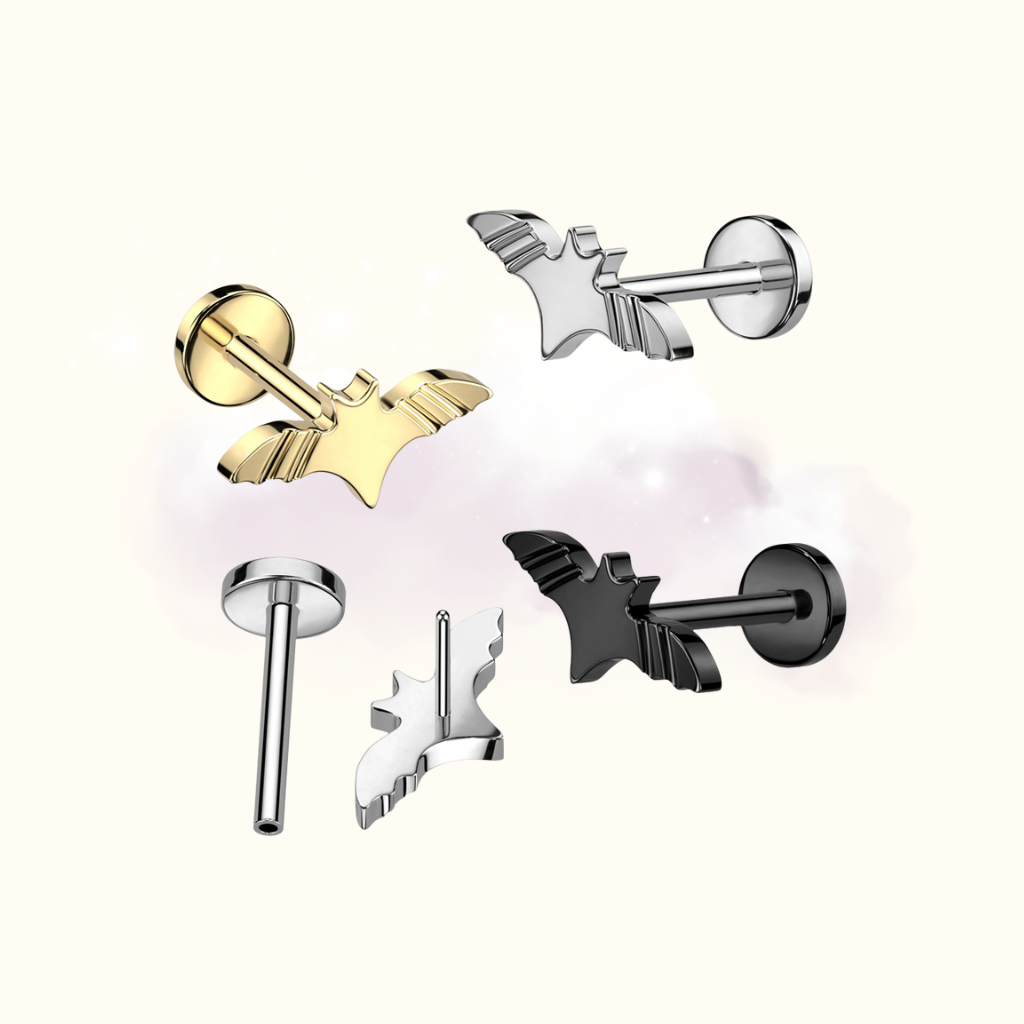 Tiny, winged, and totally cool 🦇 This flat back stud features a sleek bat-shaped top, perfect for adding a touch of edge or a hint of spooky-cute charm to your ear game. Crafted from implant grade titanium with a secure threadless push-in design, it's safe for sensitive ears and comfy enough to wear all day (and night).