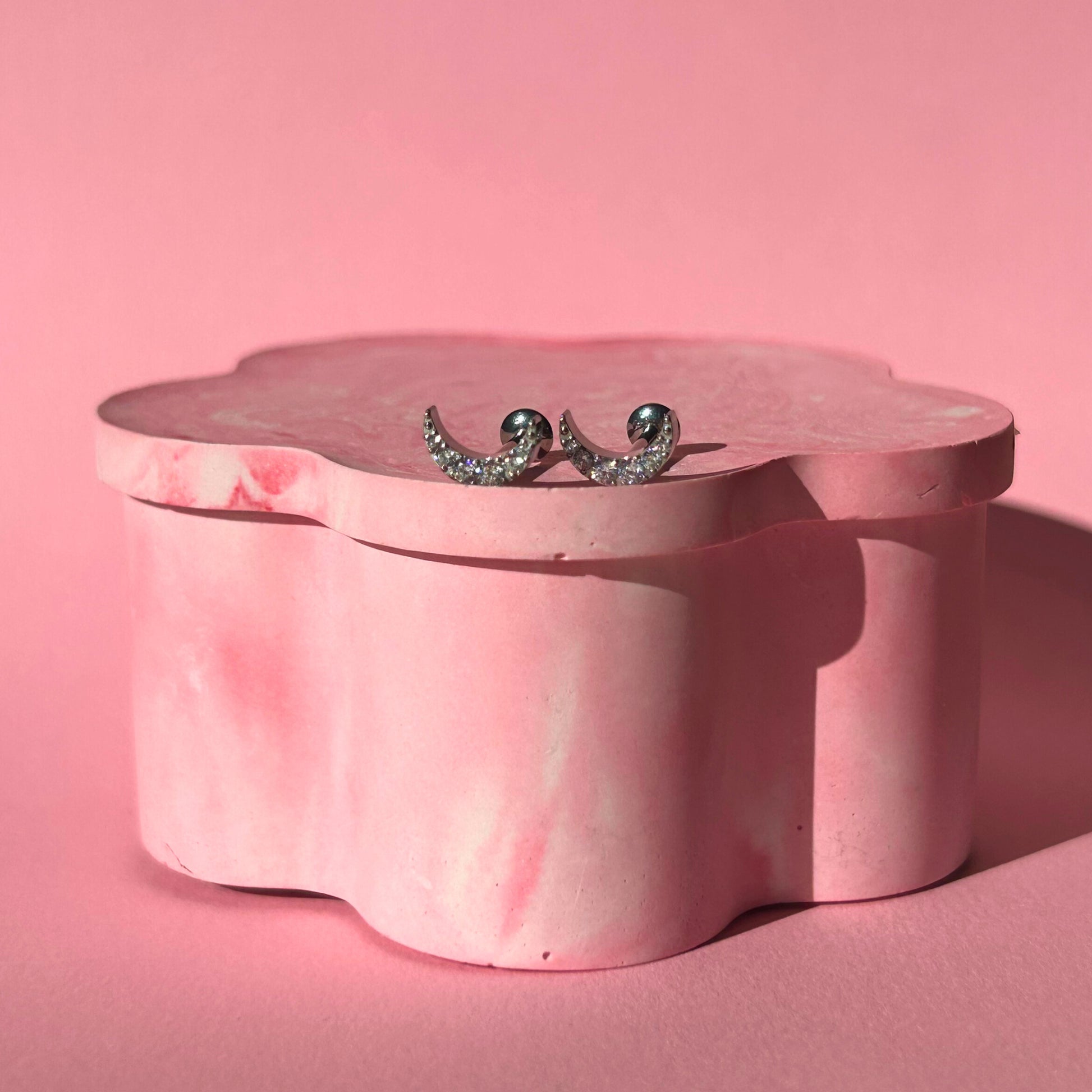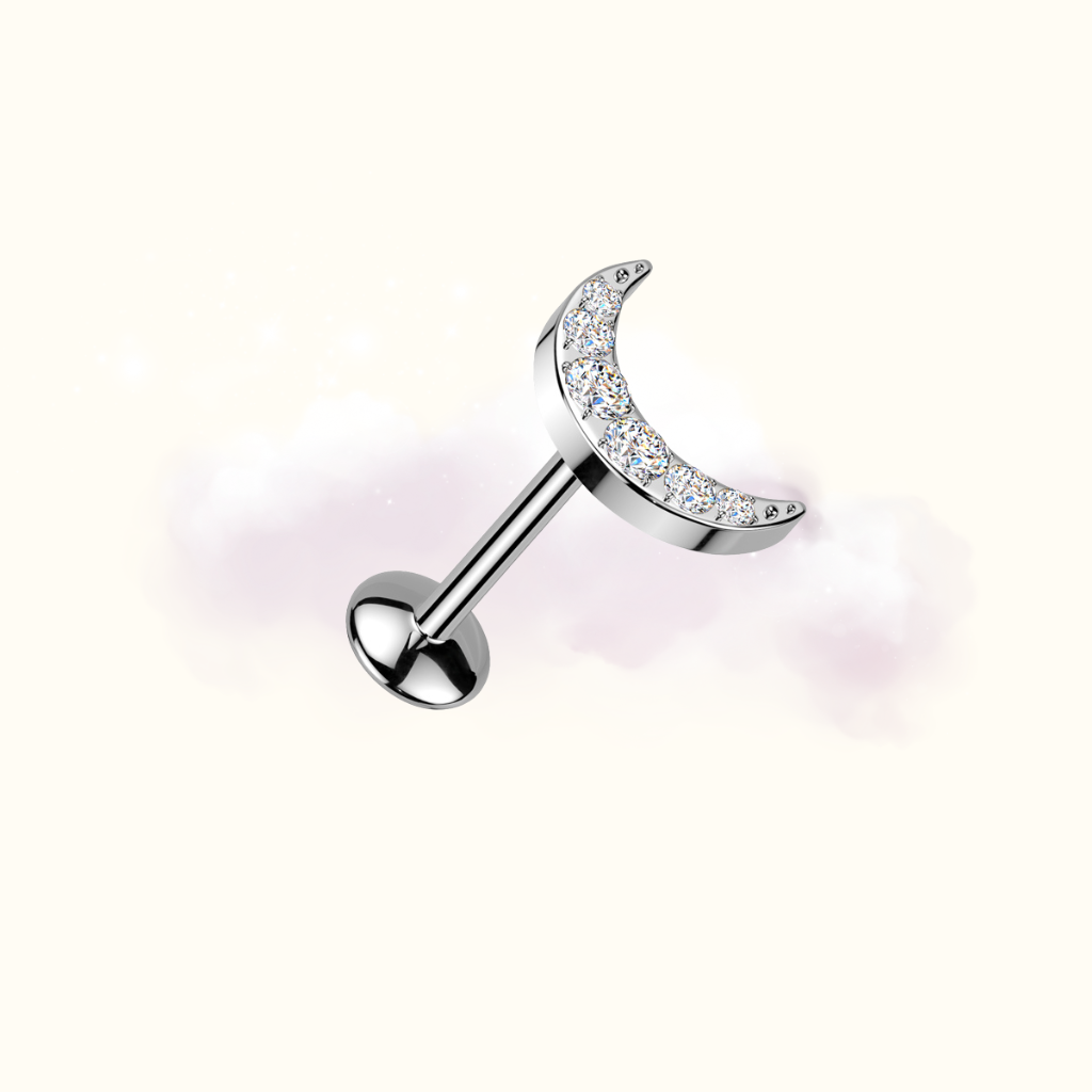 Add a little lunar magic to your ears ✨ This flat back stud features a curved crescent moon top, set with six sparkling CNC-set cubic zirconia stones for the perfect twinkle. Crafted from implant grade titanium with a threadless push-in design, it’s hypoallergenic, secure, and ultra comfy—day or night.