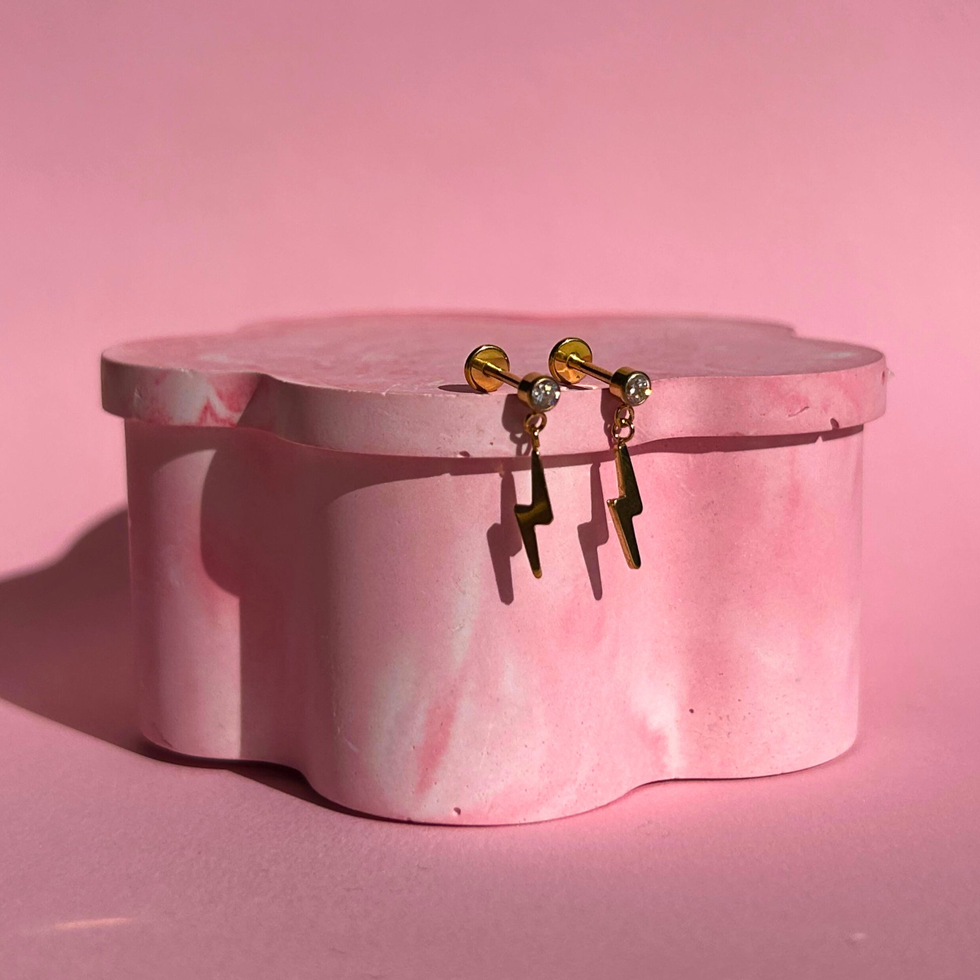 This threadless stud features a dazzling round bezel-set CZ paired with a fun lightning bolt dangle top, all crafted from safe, implant-grade titanium (ASTM F136). Perfect for keeping your piercing comfy while adding a little electric charm!